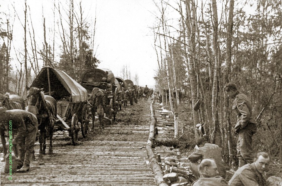 Die Kämpfe am Wolchow wurden mit Beginn des Jahres 1942 heftiger, die Rote Armee versuchte den Durchbruch zum belagerten Leningrad südlich des Ladogasees zu erzwingen. Während der Schlammperioden im Frühjahr und Herbst mussten von den Pionieren sogenannte "Knüppeldämme" gebaut werden. Der Wolchow ist für seine Überschwemmungen die Morast und Sümpfe entstehen ließen, seit jeher berüchtigt. Ähnliche Knüppeldämme übrigens haben die Menschen schon vor Jahrtausenden als Handelswege durch Sümpfe errichtet.